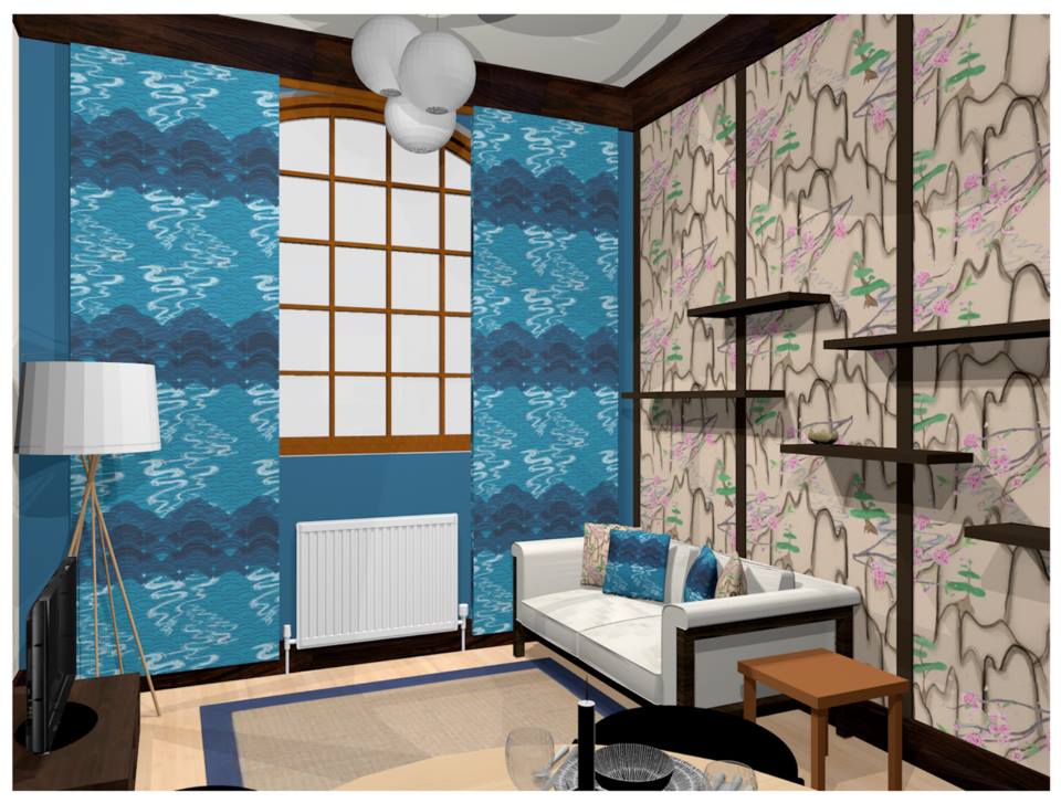 In the living room, I wanted to give it that traditional Japanese house feeling, but modernise it. So I added false wall panelling to create a faux Japanese screen wall as a feature wall. I then felt I needed to add the blue in to the room somewhere else, so I painted both shorter walls blue. By adding colour to these walls, it makes the room seem wider than what it is. I then painted the wall opposite the feature wall a cream/magnolia colour to reflect the feature wall and to lighten the room a bit as there are a lot of dark colours going on. I also modernised the room more by having a cluster of paper lampshades hanging in the lounge part of the living area and one lampshade in the dining area. I added wooden floors and placed an area rug between the sofa and tv unit to represent tatami mats, linking the modern and traditional designs together. On the feature wall I designed some floating shelves to be hung at random and at different levels. This was to create some more interest in the room and provide some storage space. I really love this design! It’s traditional Japanese meets modern Western design.