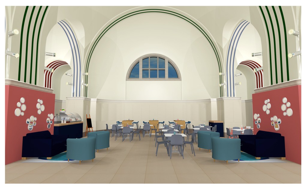 Here are the visuals! I am happy with the layout of the space. I made sure that there was enough space and wheelchair access to the country and that the children’s area was on another side. I placed bar tables and stools at the back of the dome. I painted the boards that wrap the pillars coral, which meant that it is removable or could be painted back to white, this also meant that mirrors could be hung. The counter is made completely out of wood and is placed near the door at the back that has all the electrical machinery it needs for a working till. If plumbing is required for a dishwasher or sink to clean plates, the kitchen part of the cafe would be hidden behind the painted pillar next to the counter so that it was out of sight and could also then be reverted back to normal, as it would not be seen.