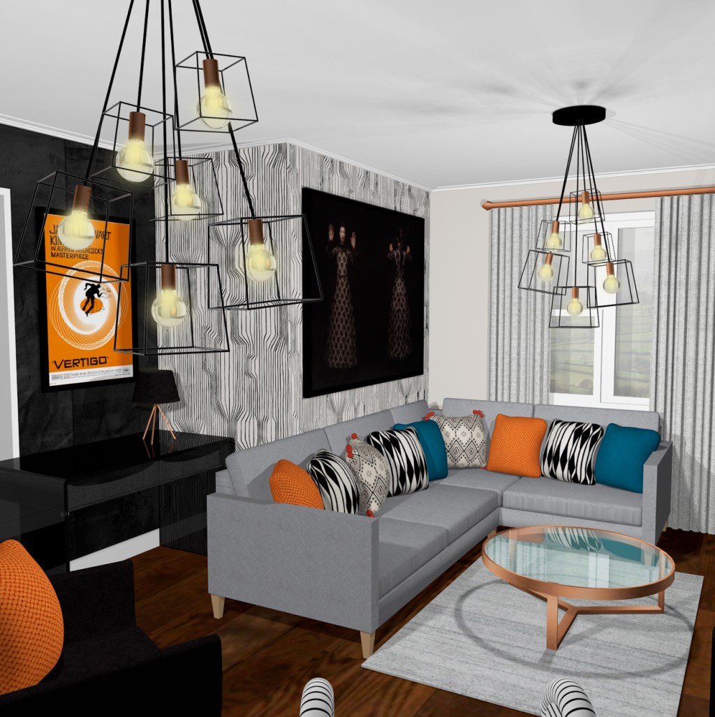 I based the scheme for the room off of Mrs Lloyd’s love for the work of Japanese fashion designer Yohji Yamamoto, which links to one of their Photography prints they wanted to display within the space, but I also wanted to inject some of Mr Lloyd’s personality in there in the form of bright contrasting colour, which links to their orange Vertigo poster by Saul Bass. This was what I resulted in as my concept: